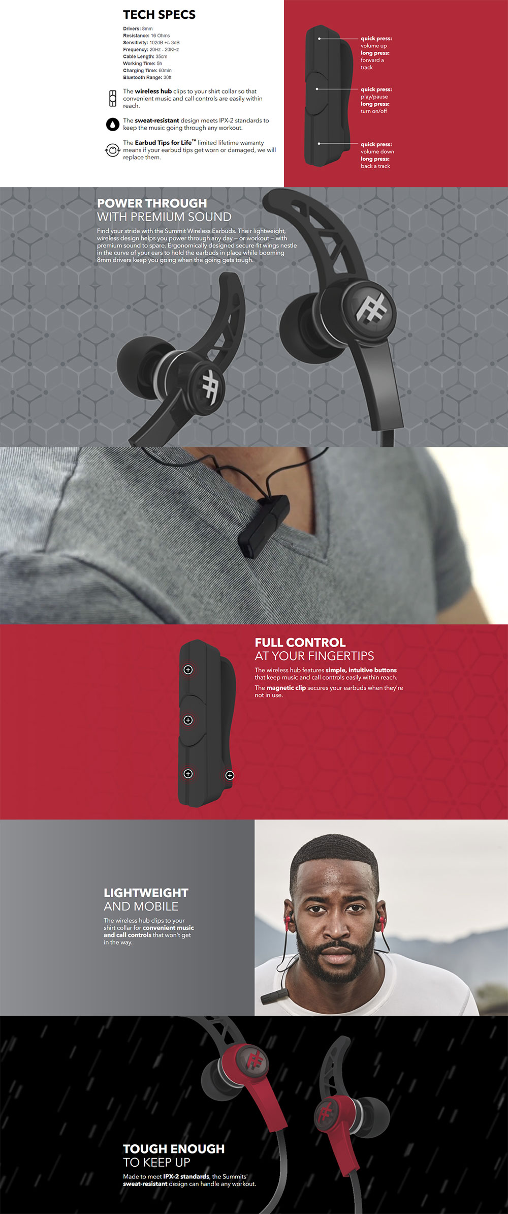 Made to meet IPX-2 standards, the Summits’ sweat-resistant design can handle any workout.