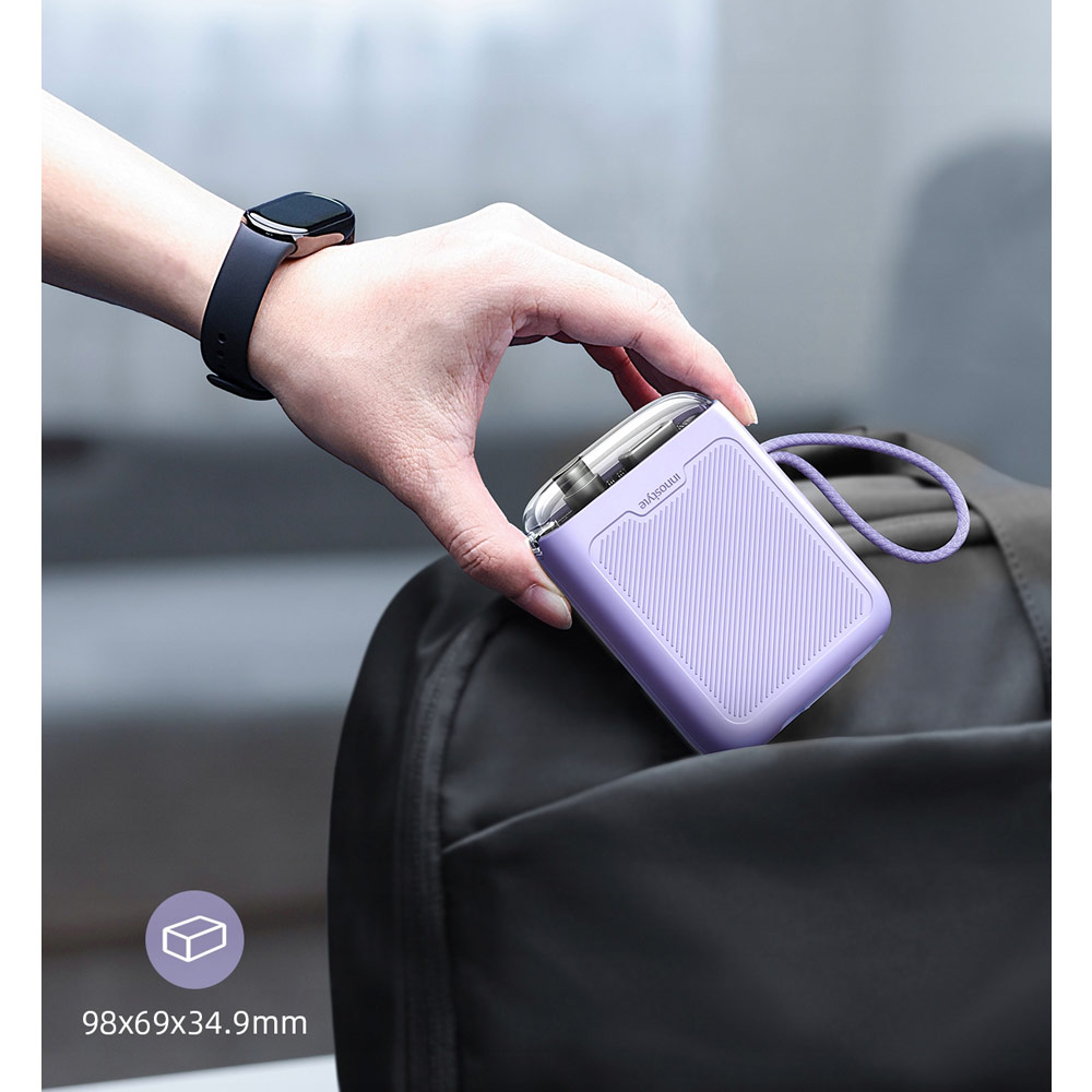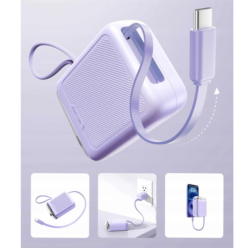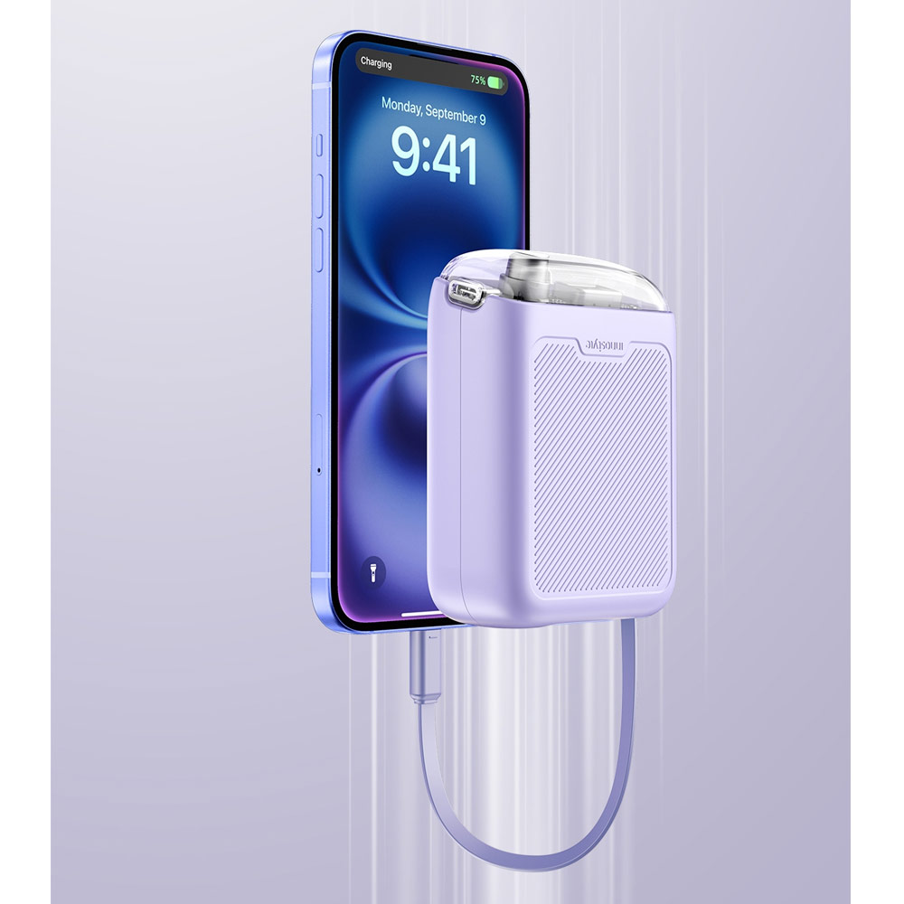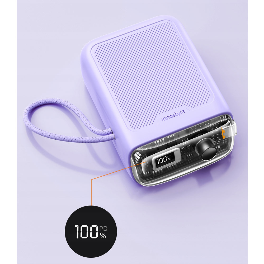 Innostyle CCC 3C Certified Power Bank TransiMini FlexCharge Retractable 30W 10000mAh 60cm USB-C Small Mini Compact Size Power Bank with Cable (Lavender)