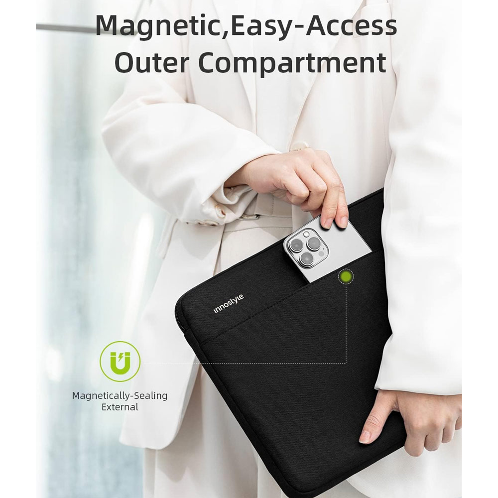• Quick and Easy Access: The slim laptop sleeve with front pocket is designed to hold chargers, cables, mouse, external backup drives, and other essentials. With a magnetic-sealing closure, it is always within reach and convenience to use