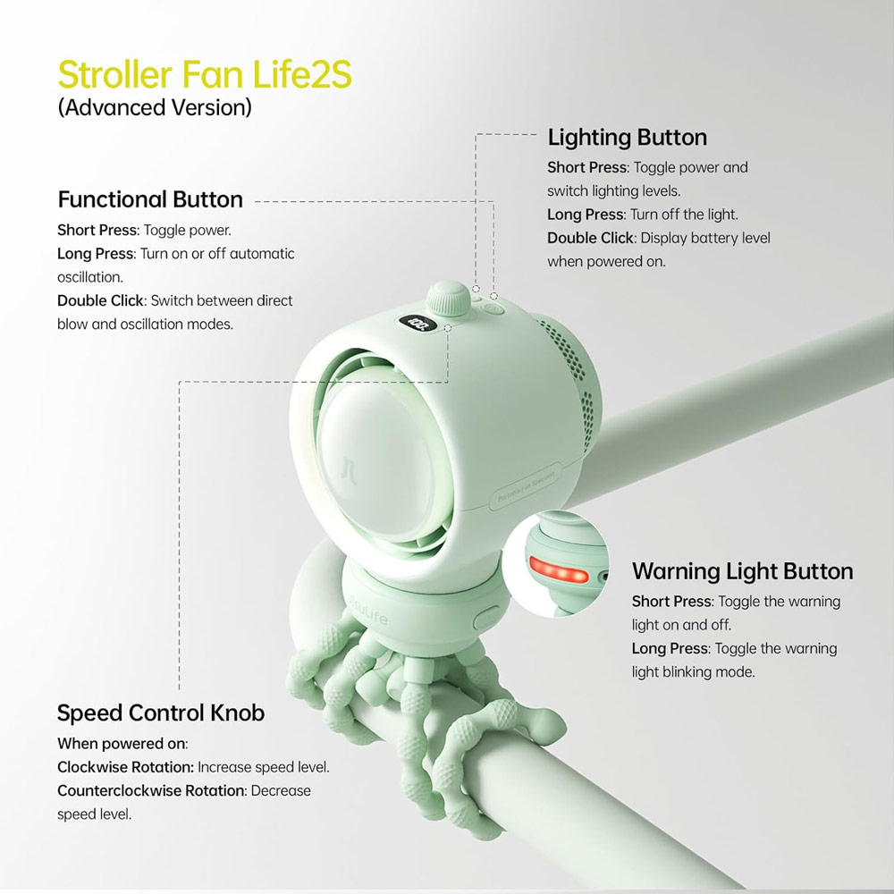 - Soft Ring Light: There is an LED light control switch on the top of the baby stroller fan, which can easily switch between different brightness levels. Whether home, office or public place, the three-speed lighting can provide suitable lighting