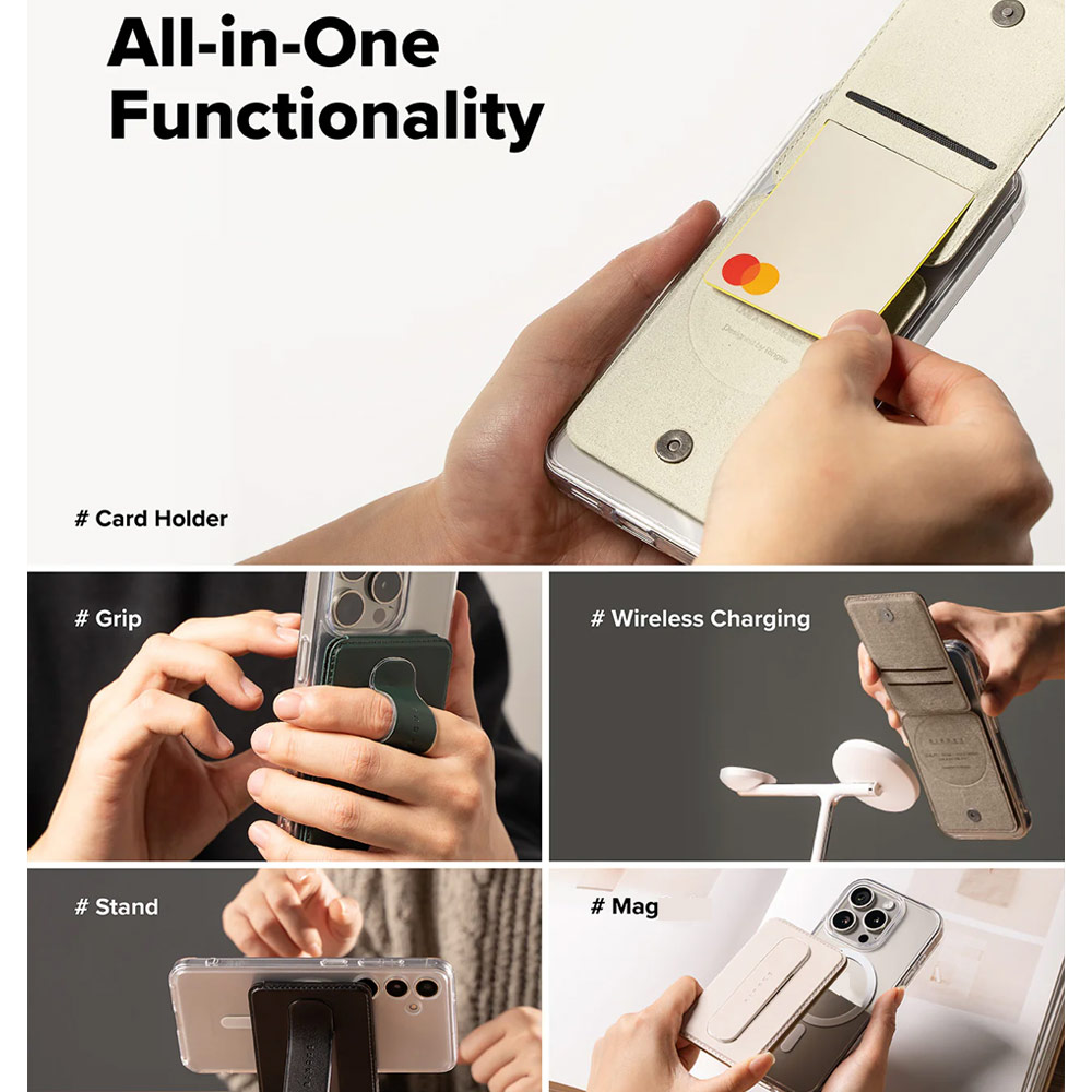 • All-in-One card holder, phone grip, and kickstand