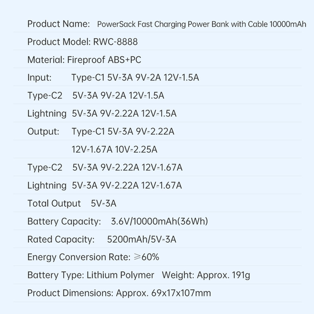 - Rated Capacity: 5200mAh/5V-3A