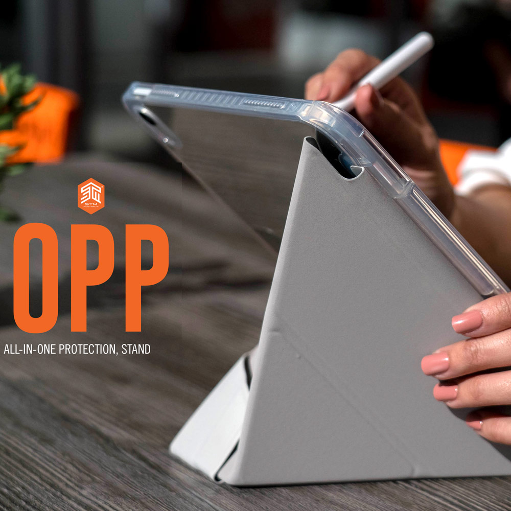 • Seize the opportunity with the Opp iPad Folio Case. Not just slim and drop-protective, it’s got a clever twist: an origami cover that turns into a vertical or horizontal stand. Whether you’re streaming, surfing, or selling, this case opens up new possibilities for life on the move.